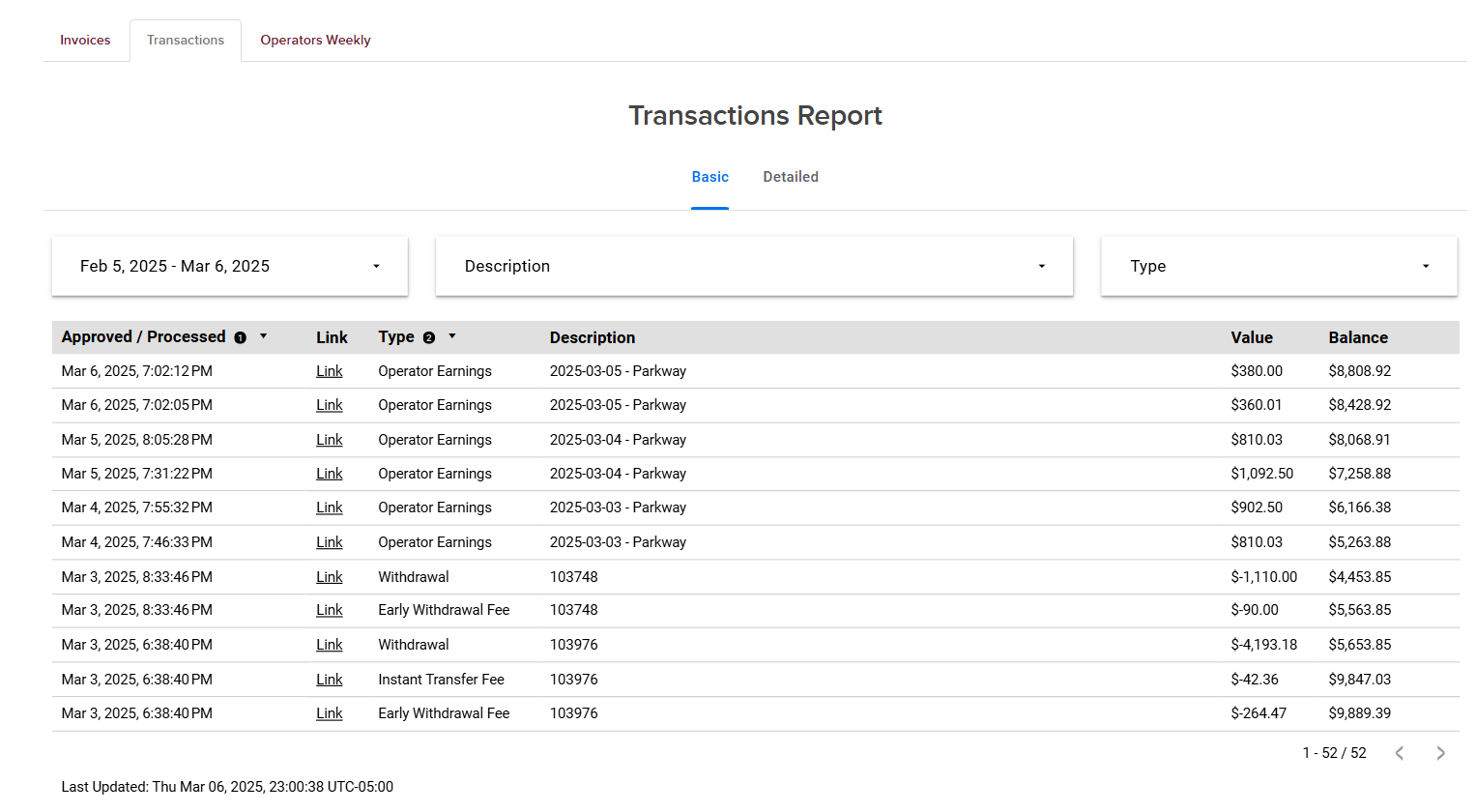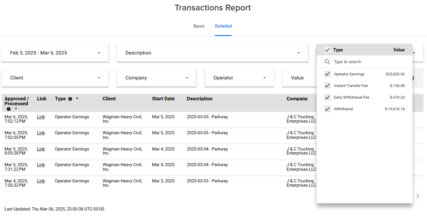 The Transactions Report allows you to see all of the transactions in / out of your account (earning tab). The Approved / Processed date is the date of the transaction (withdrawal, fee applied, date of job task approved or moved to dispute). The Link brings you to the job of the task that is associated with that transaction. Type is the type of fee which includes the following: Operator Earnings, Dispatch Earnings, Early Withdrawal Fee, Platform Fee, and Withdrawal. All of this can be filtered to see a specific type of transaction. The Description is the date and name of the job. Value is the amount of the transaction and balance is the amount in your account after the transaction was completed.