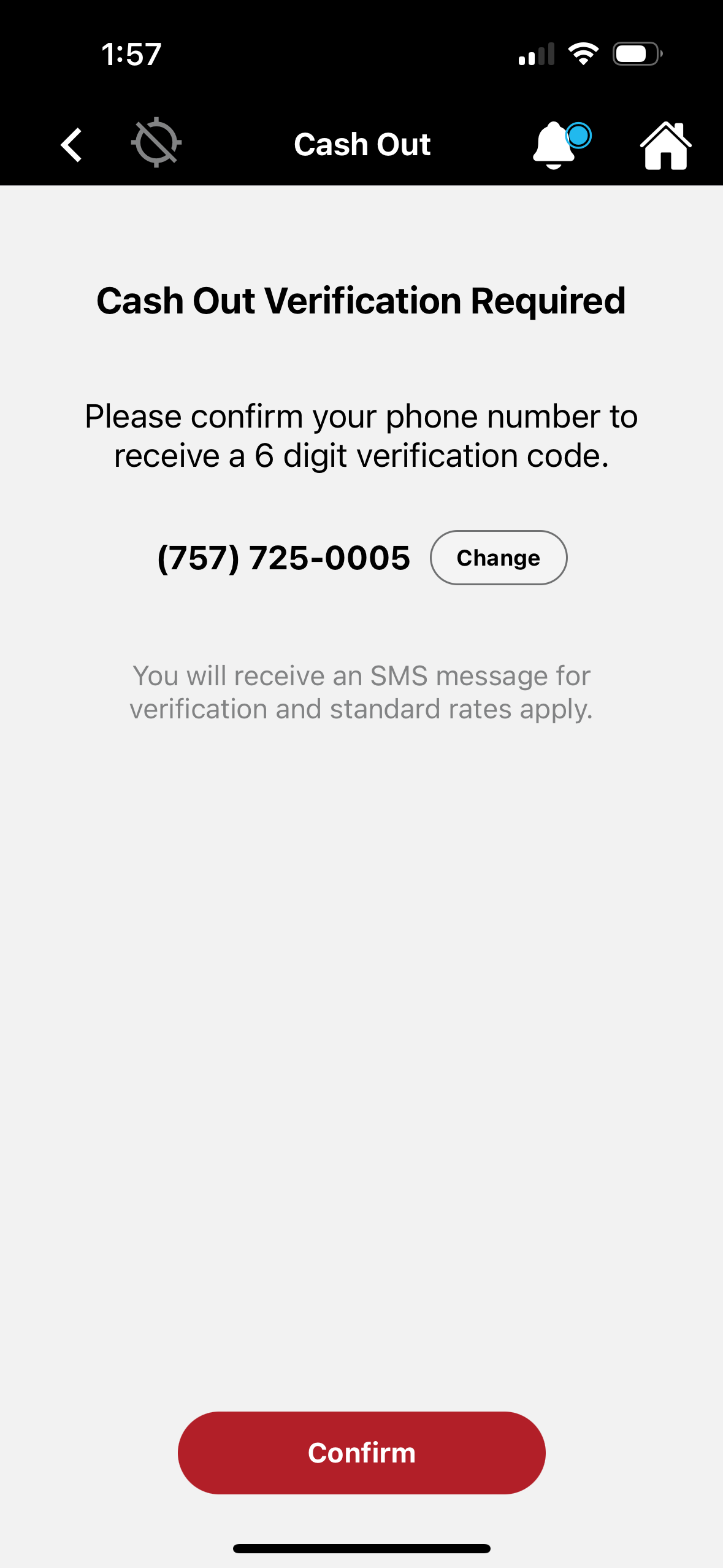 To withdraw money, you will first have to confirm your phone number to receive a 6 digit verification code. Once you confirm your number, you will receive a verification code that you must enter.