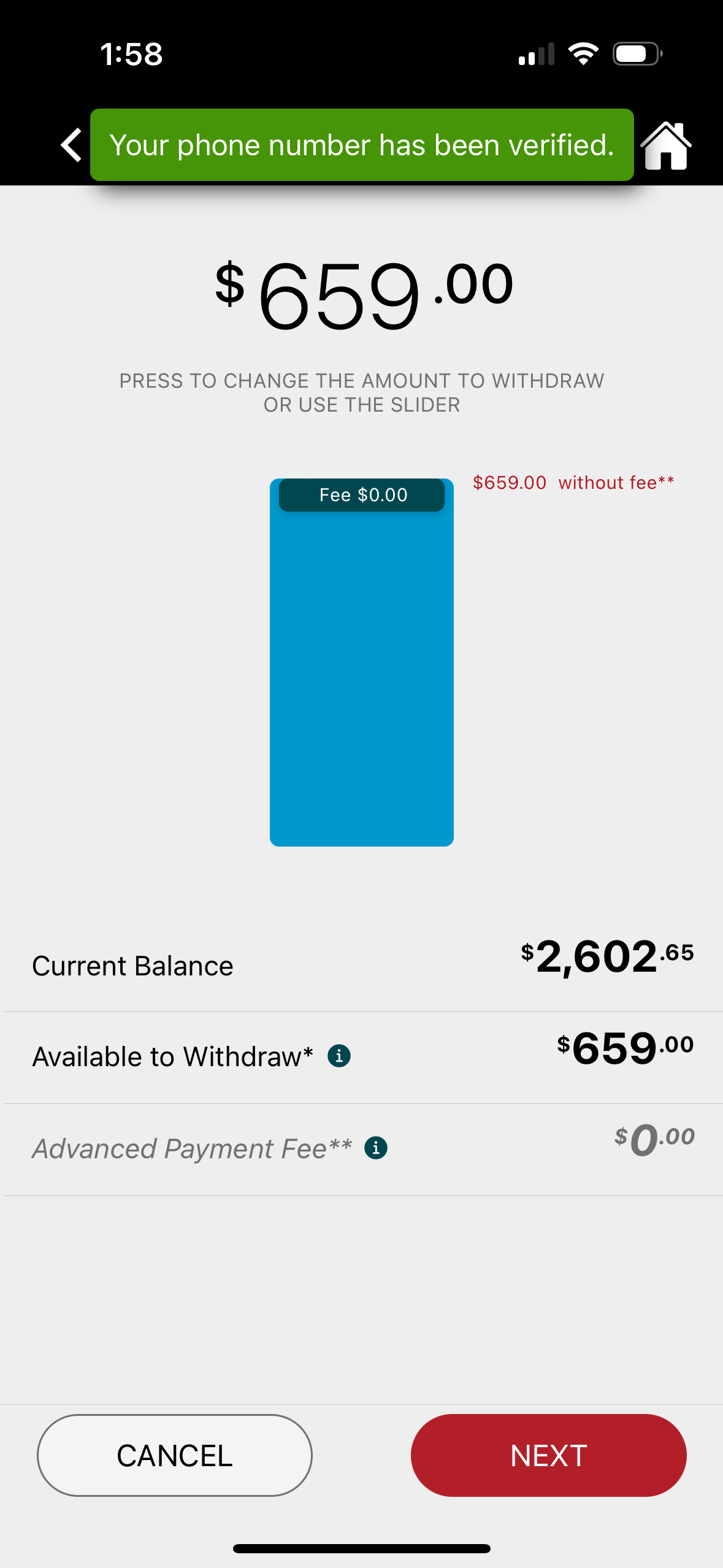 After verification, you will see the message that your phone number has been verified, and that you are now ready to continue cashing out.