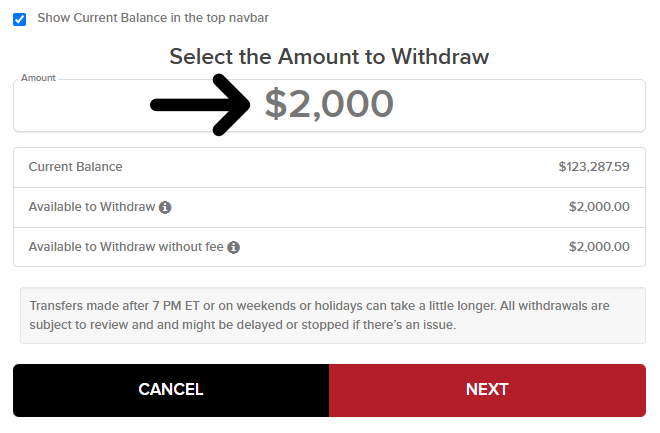 Once confirmed, you will be prompted to type in the amount that you would like to withdraw and click Next.