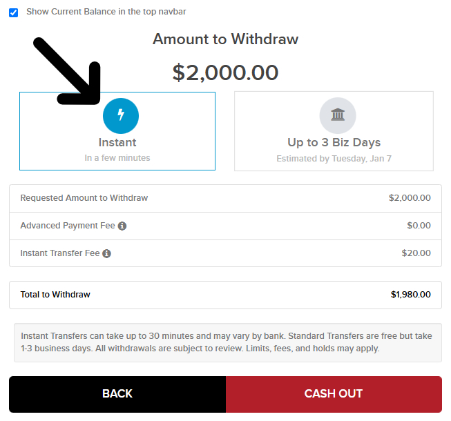 For Instant transfer, select the instant option by clicking on it. You will see the Instant Transfer Fee value calculated based on a 1% fee. There is a $50 maximum. Then click the Cash Out button.